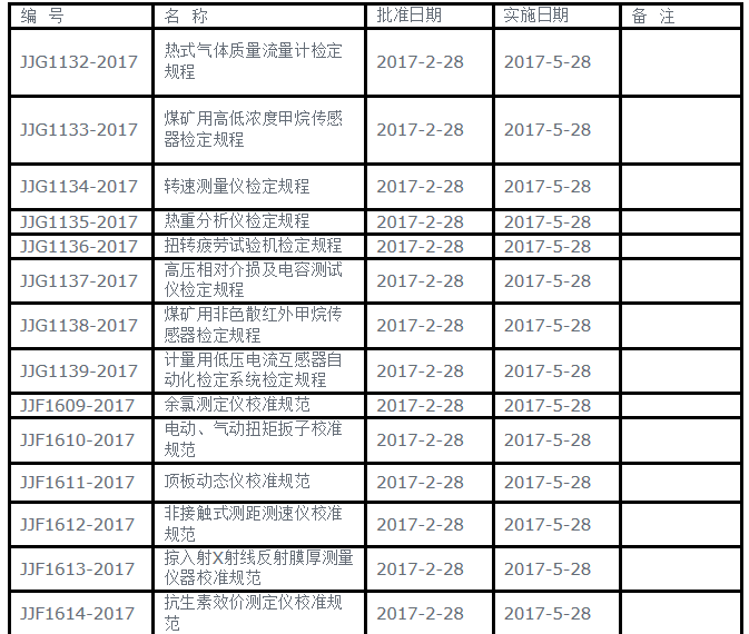 日前,國家質(zhì)量監(jiān)督檢驗檢疫總局發(fā)布《熱式氣體質(zhì)量流量計檢定規(guī)程》等27個國家計量技術規(guī)范。其中,熱式氣體質(zhì)量流量計檢定規(guī)程、掠入射X射線反射膜厚測量儀器校準規(guī)范、轉(zhuǎn)速測量儀檢定規(guī)程、熱重分析儀檢定規(guī)程等21項儀器計量技術規(guī)范在內(nèi)。