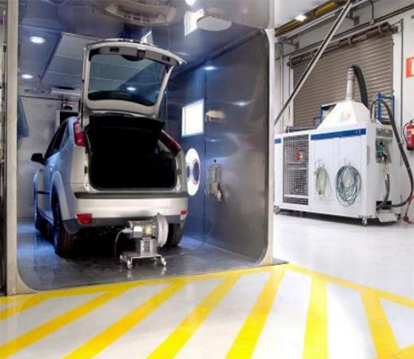 然后,再將其推回試驗間,密閉并保溫1小時,稱為熱浸試驗。同時測試室內(nèi)碳?xì)浠衔锏臐舛茸兓?,并記錄其平均值。晝間換氣與熱浸試驗所測試得的碳?xì)浠衔餄舛鹊目偤停礊樵囼炣囕v燃油蒸發(fā)試驗的總排放量。這種方法試驗設(shè)備價格昂貴,但測試精度高,能夠測試整個車輛(包括燃油系統(tǒng)、內(nèi)飾涂料、噴漆、輪胎等)揮發(fā)出來的碳?xì)浠衔镂廴疚锟偭浚菄庥脕頊y試燃油蒸發(fā)排放量的較為普遍的試驗方法。